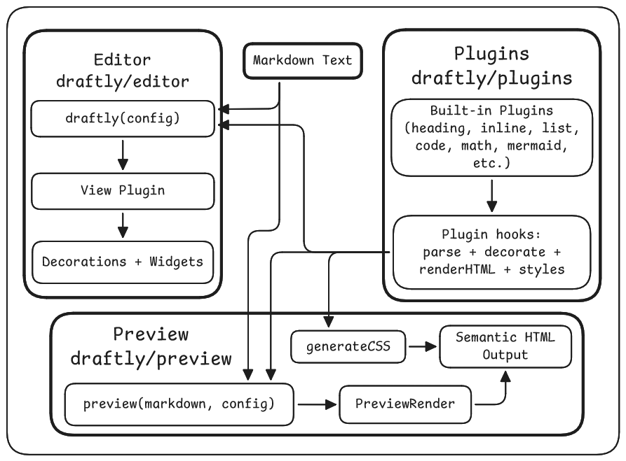 If you are building a documentation platform, a knowledge tool, a note-taking app, or anything that lives on Markdown, Draftly is meant to fit naturally into that workflow. And if you care about clean architecture and extensibility, you will probably enjoy looking under the hood.